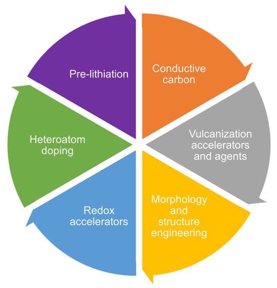 Researchers have developed many effective strategies for SPAN cathode modification to improve the electrochemical performance. These strategies could be categorized into six primary research directions: conductive carbon additives, vulcanization accelerators, morphology and structure engineering, redox accelerators, heteroatoms doping, and pre-lithiation of SPAN (Scheme 2). The details are presented below.