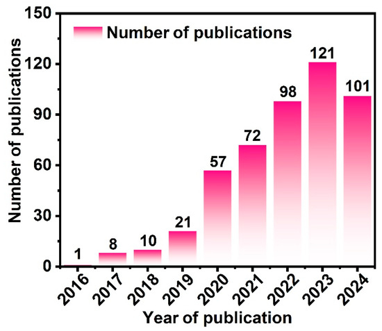The data adopted in this article are from the Web of Science Core Collection Science Citation Index (SCI) database. Based on literature research and expert consultation, precise search formulas were constructed around the key terms. The data retrieval and collection were conducted on 1 April 2025. The collected paper data were manually screened and preprocessed. Firstly, the missing data in the papers were deleted. Then, the titles and abstracts of the papers were checked to remove irrelevant distractions. Finally, the names of the institutions were standardized to ensure uniformity of the institution names in the papers. Combining the theme of quasi-solid zinc-ion batteries and the time range from 2016 to 2024, after constructing the search formula, the initial collection of paper and patent literature information was completed. The paper formulas are as follows: TS = (zinc-ion battery or Zn-based battery, or zinc battery or zinc-metal battery) AND TS = (quasi-solid or quasi-solid-state). A total of 489 studies were retrieved. Meanwhile, the relevant research literature was subjected to cluster analysis using the VOSviewer software. During the data analysis process, mainly visualization charts were employed, combining both quantitative and qualitative analysis methods.