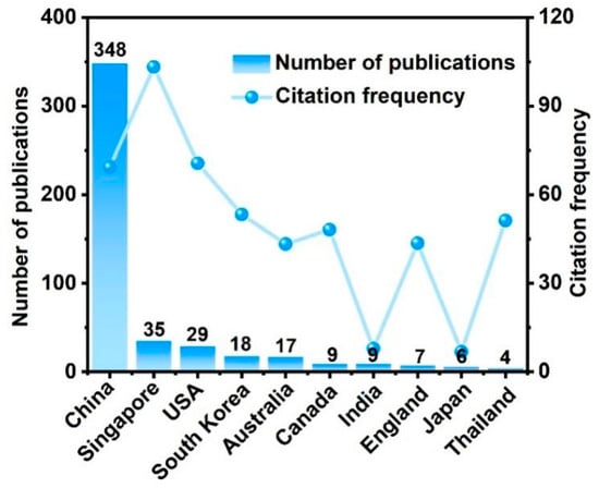 However, among the top 10 countries/regions, the average citation frequency of research papers from China is not the highest (69.15 times per article), indicating that while China leads in terms of quantity in this field, there is still a need to improve in terms of quality. Singapore demonstrates exceptional research influence, achieving the highest citation frequency of a single article (103.2 times per article) in the related papers, indicating that Singapore has high innovation quality and influence in this field, and the results have been widely recognized and cited by international peers. The United States, despite contributing only 29 papers (5.93%), ranks second globally in citation impact (70.62 citations per article). Australia and Canada have published 17 papers (5.25%) and 9 papers (5.07%), respectively, with average citation frequencies of 53.29 and 48.11, respectively, indicating impactful research contributions. In addition, Pakistan and Germany have published three papers (0.728%) and two papers (0.485%), respectively, and achieve remarkably high citation frequencies of 114.66 and 183.5 per article. This indicates that despite a limited publication volume, both nations produce exceptionally high-quality research with significant international recognition in this field.