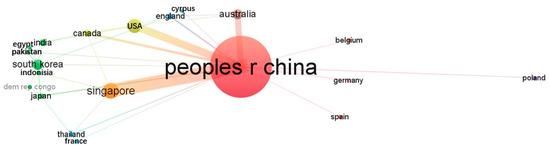Taking the countries/regions in the sample data as nodes, a visualization map of international scientific research cooperation was drawn using VOS viewer, as shown in Figure 3; this reveals the international cooperation network of the field of QSAZBs. The size of the nodes in the figure represents the research activity of each country—that is, the number of published papers—while the lines between the nodes indicate the scientific research cooperation relationships among these countries. Line thickness reflects the frequency and intensity of the cooperation. China stands out as having the largest node size, highlighting its central position in global cooperation and demonstrating strong research partnerships with Singapore, the United States, and Australia. Both China and Singapore have relatively large nodes, indicating their significant research outputs and cooperation in this field. The lines between China and North American countries such as the United States and Canada are also relatively thick, indicating that China has close scientific research exchanges with these North America countries. Although European countries such as England and Germany have relatively small nodes, they maintain scientific research cooperation with other countries through relatively thin lines, demonstrating the global nature of this field. These cooperative relationships indicate that countries such as China, Singapore, the USA, Australia, and South Korea have not only demonstrated the rich results of their research in promoting the development of QSAZBs, but also have a significant influence on international cooperation, jointly contributing to the progress of this field. These cooperative relationships suggest that international cooperation in the field of QSAZBs is continuously strengthening, and all countries are actively participating in and promoting the development of this technology.