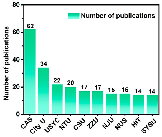 Analysis was conducted on the affiliations of the collected research paper related to the field of QSAZBs in order to identify the authoritative research institutions and their geographical distribution. In the global research on QSAZBs, a total of 433 institutions are engaged in research; some of these are summarized in Table 3. Further analysis in Figure 4 shows the top ten institutions in terms of the number of published papers in the field of QSAZBs. The Chinese Academy of Sciences (CAS) led the pack with 62 papers and a 15.05% share, establishing itself as a major research institution in this field. Close behind were City University Of Hong Kong (City U) and the University of Science Technology of China CAS (USTC), ranking second and third with 34 papers (8.25%) and 22 papers (5.34%), respectively. The output and influence of these two institutions were also quite significant. Nanyang Technological University (NTU), Central South University (CSU) and Zhengzhou University (ZZU) followed in fourth and fifth place with 20 papers (4.85%) and 17 papers (4.12%), further demonstrating the research strength of Chinese and Singaporean institutions in this field.