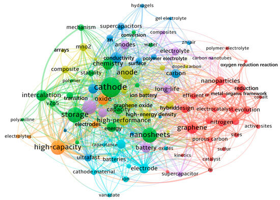Based on the analysis of keywords in the field of QSAZBs using VOSviewer software, from the literature on QSAZBs, 93 keywords with occurrence frequencies of more than five were extracted. Table 4 illustrates the frequency and total link strength of the keywords in the literature-based occurrence frequencies, noting those mentioned more than 10 times. After filtering irrelevant words, a network for co-occurrence and clustering analysis of keywords was constructed, and the co-occurrence network map of keywords was drawn, as shown in Figure 5. In the network visualization, edges between nodes denote co-occurrent relationships, with thicker edges indicating stronger associations. For example, the thickest edge connects “quasi-solid electrolyte” and “hydrogel” (co-occurrence strength = 32), underscoring the synergy between gel-based electrolytes and quasi-solid systems. Similarly, dense edges link “cathode materials” to “MnO2” (frequency = 45) and “V2O5” (frequency = 38), demonstrating the dominance of manganese- and vanadium-based oxides as mainstream cathode materials.