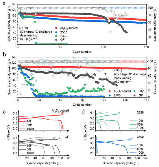 Electrochemical performance of anode-free full cells with different separators. (a) Long-term cycling stability at 1C charging. (b) Long-term cycling stability at 2C charging. (c,d) Corresponding voltage-specific capacity profiles at the 10th, 50th, and 100th cycles.