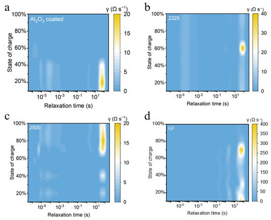The distribution of relaxation times (DRT) analysis of the impedance of the full cell at different states of charge (SOCs) was further conducted. DRT spectra derived from electrochemical impedance spectroscopy (EIS) reveal distinct relaxation processes governing interfacial kinetics across separators (Figure 3). The magnitude of the relaxation time distribution highlights the relative contribution of each electrochemical process, while the x-axis spans critical relaxation times (10−5 to 10 s). The DRT spectra universally exhibit a dominant peak in the medium-frequency region (τ ≈ 0.001–0.1 s), corresponding to charge-transfer resistance at the electrode interfaces. Notably, both the 2500 and Al2O3-coated separators show lower peak magnitudes than 2325 and GF, indicating reduced baseline impedance attributable to separator thickness. Critically, the Al2O3-coated separator manifests a pronounced charge-transfer peak only at low SOC during initial Na nucleation, suggesting transient kinetic limitations at early plating stages. And this peak rapidly attenuates at higher SOC, signifying stabilized interfacial kinetics. In stark contrast, conventional separators exhibit escalating charge-transfer peaks at high SOC, reflecting progressive interfacial degradation driven by inhomogeneous Na plating. This morphology instability promotes parasitic electrolyte decomposition and resistive byproduct accumulation, impeding charge transfer and amplifying impedance.