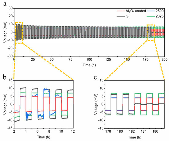 To further investigate the reversibility of Na deposition/stripping on the current collector, Figure 4 presents the galvanostatic cycling performance of Na||Na symmetric cells employing the four investigated separators under 1 mA cm−2 and 1 mAh cm−2. The voltage hysteresis, a direct indicator of interfacial resistance and polarization, exhibits significant divergence among the separators. Critically, cells utilizing the Al2O3-coated separator demonstrate exceptionally stable cycling with the smallest and most consistent polarization voltage throughout the test, maintaining an ultralow hysteresis of approximately 4.5 mV. This minimal polarization signifies highly reversible Na plating/stripping kinetics and superior interfacial stability. In stark contrast, cells with the GF separator display the largest voltage hysteresis, indicative of substantial interfacial resistance and inefficient Na+ transport. Furthermore, the GF-based cell suffers catastrophic failure characterized by a sudden voltage drop to near zero volts at approximately 200 h of cycling, unambiguously signifying an internal short circuit induced by Na dendrite penetration. While the 2500 and 2325 separators show intermediate performance, their polarization voltages remain significantly higher than that achieved with the Al2O3-coated separator. These results highlight the exceptional efficacy of the Al2O3-coated separator in suppressing dendrite growth and ensuring stable, safe operation of Na metal interfaces.