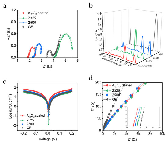(a,b) EIS and the corresponding DRT analyses of different separators in symmetric Na-Na cells. (c) Tafel plots of different separators in symmetric Na-Na cells. (d) Nyquist plots of different separators in symmetric stainless steel–stainless steel cells.