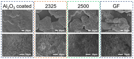 To elucidate the critical link between separator properties and Na deposition behavior, we directly characterized the morphology of deposited Na on AlC current collectors at a current density of 1C (Figure 6). Strikingly, SEM imaging reveals that the Al2O3-coated separator enables the formation of an exceptionally dense, compact, and planar Na layer with minimal surface irregularities, indicative of highly uniform nucleation and growth that effectively suppresses dendrite initiation. Conversely, Na deposited using 2500, 2325, and GF separators exhibits severely heterogeneous, porous, and dendritic morphologies, featuring extensive mossy structures, sharp protrusions, and deep voids. Higher-magnification analysis further underscores this fundamental contrast. This undesirable porous morphology drastically increases the active surface area, accelerating parasitic electrolyte decomposition and unstable SEI formation, while simultaneously compromising mechanical cohesion, thereby promoting dendrite penetration and premature cell failure. The superior interfacial stability and cycling performance achieved with the Al2O3-coated separator are thus directly attributable to this markedly denser and more homogeneous Na deposition morphology.