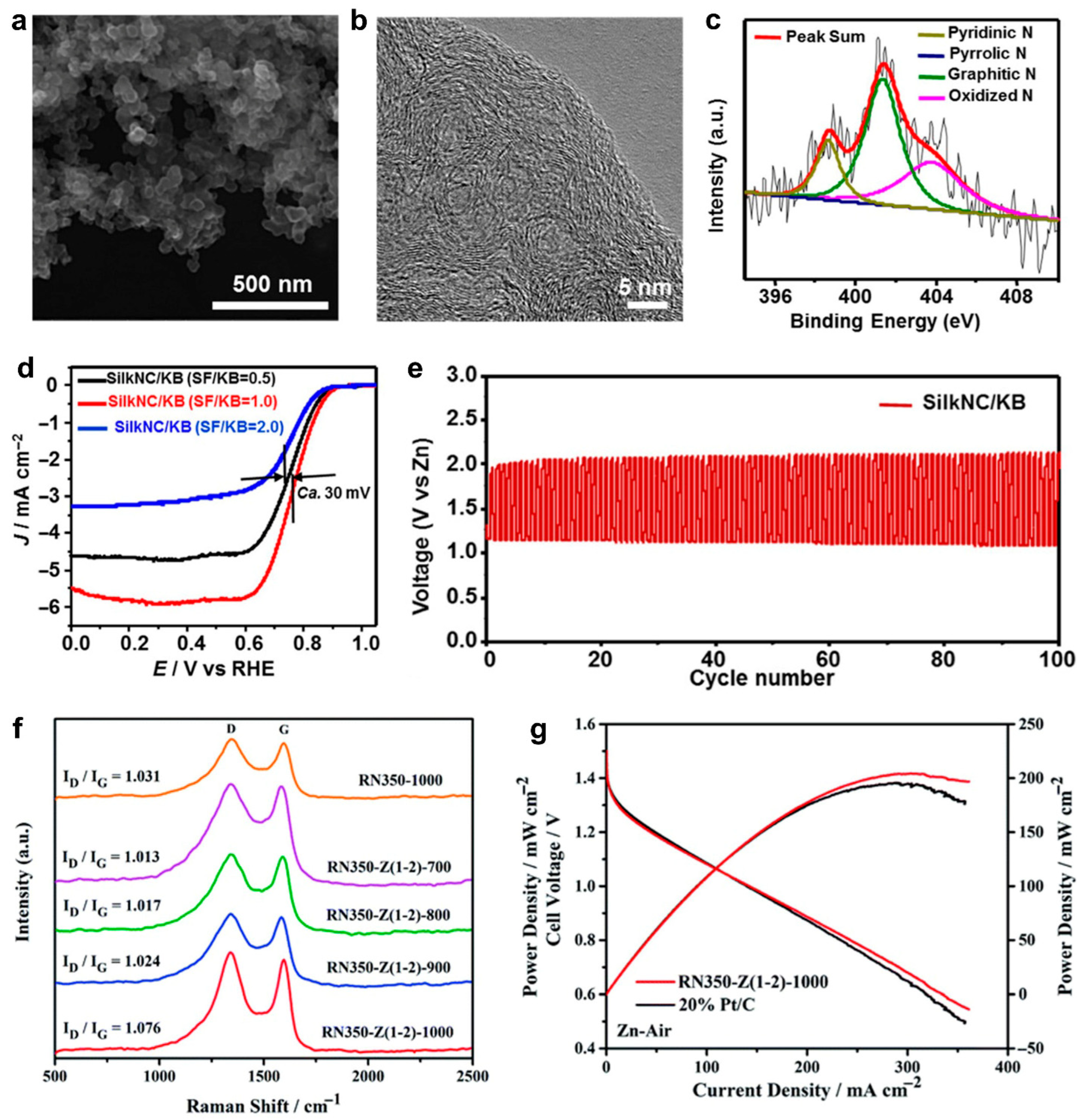| Silk | Defect-rich and N-doped carbon | Zn–air | Voltage gap = 1.39 V, voltaic efficiency = 41.3% after 100 cycles | 6.0 M KOH + 0.2 M ZnAC, PVA aqueous gel | Zn | [47] |