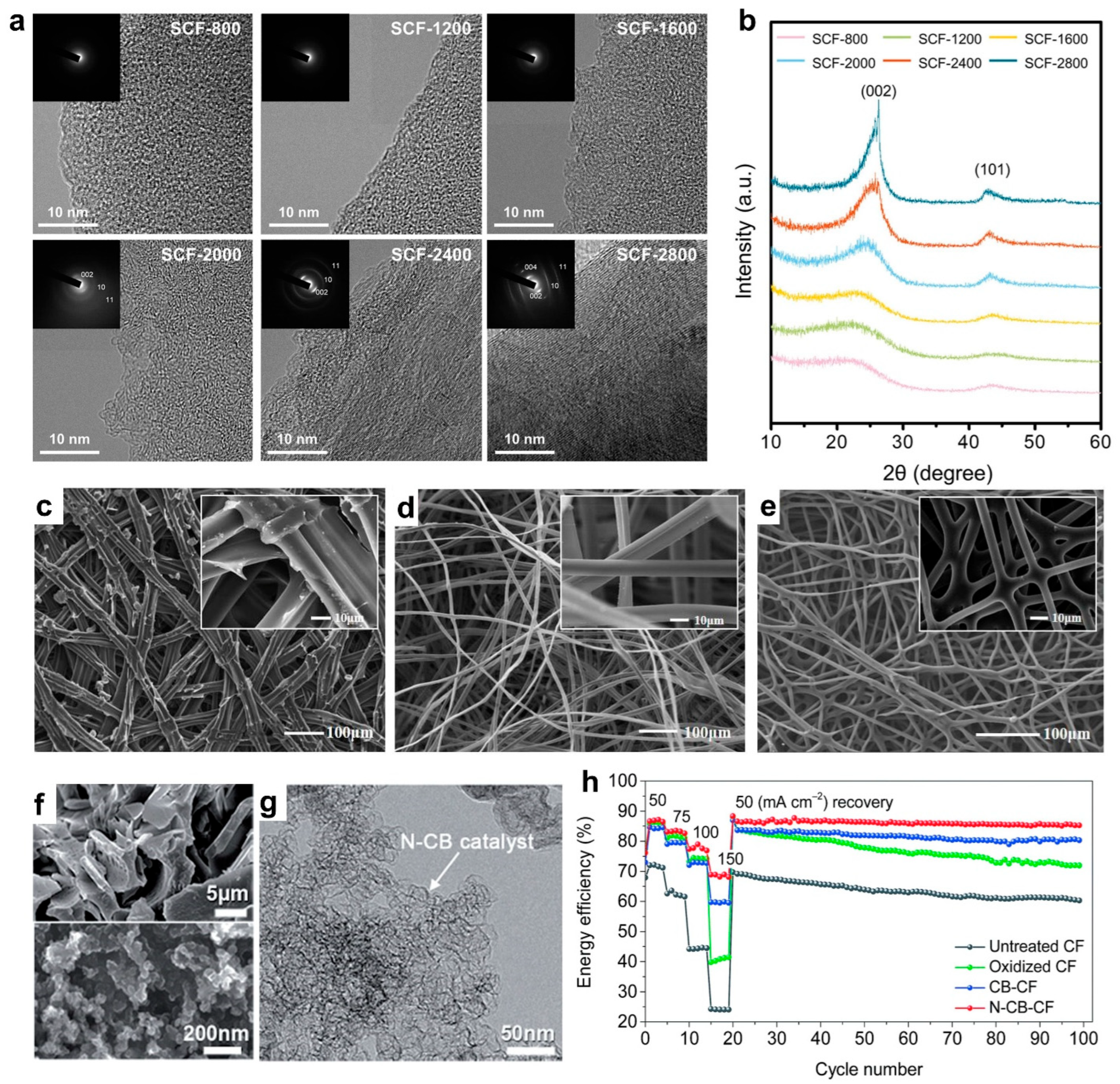 | Pyroprotein | Carbon felts@ pyroprotein | All-vanadium redox flow batteries | ΔEp = 0.17 V, energy efficiency = 90% at 40 mA cm−2 | 0.1 M VOSO4 in 2 M H2SO4 | Three electrodes | [51] |