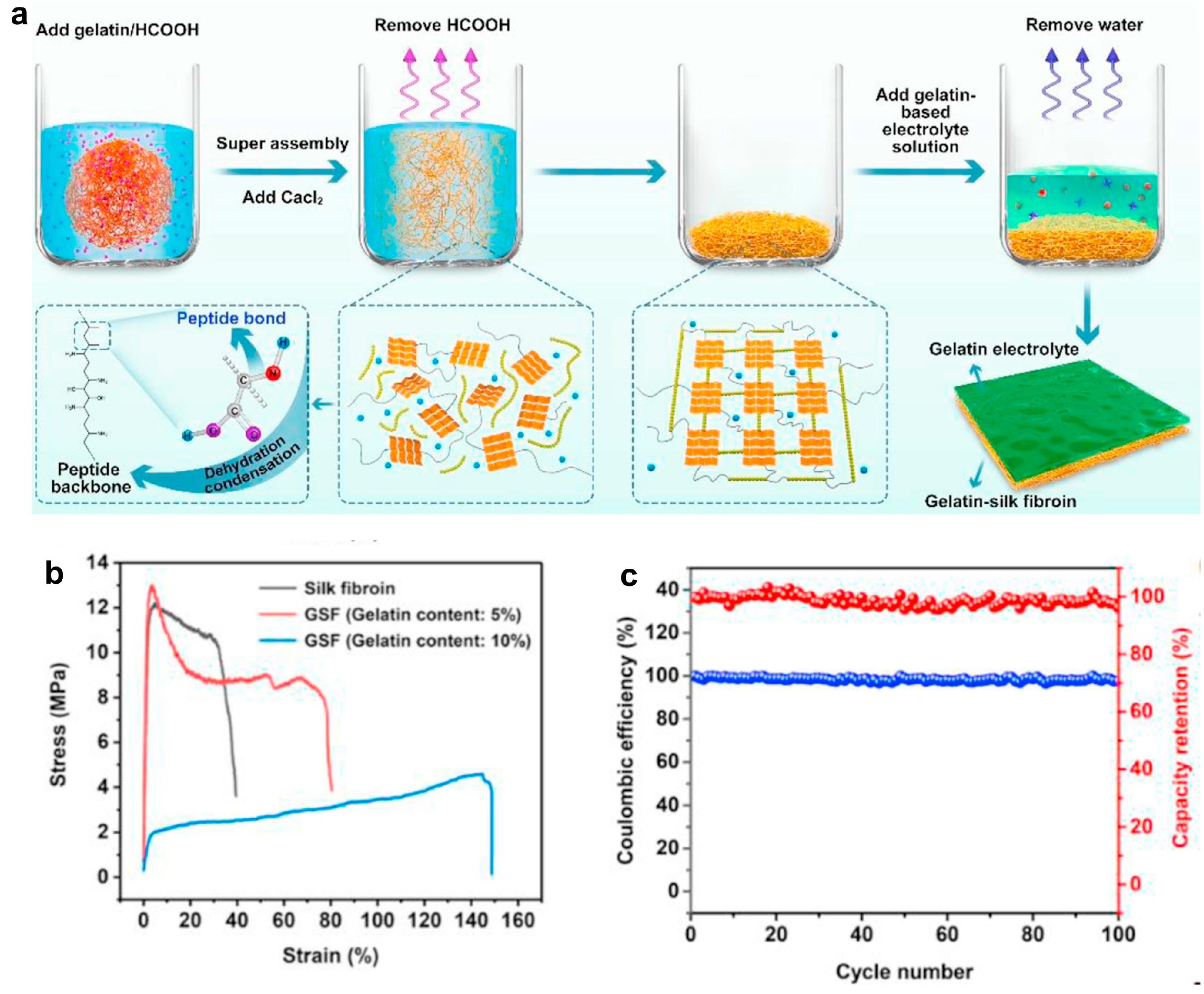 - Proteins also served as promising candidates in gel electrolytes for biodegradable and flexible Zn-ion batteries. A gelatin-silk protein composite formed a plasticized gel matrix with good ionic conductivity and mechanical robustness. The gel electrolyte delivered consistent voltage output and degraded in enzymatic environments, aligning with growing interest in transient and eco-friendly energy storage technologies.