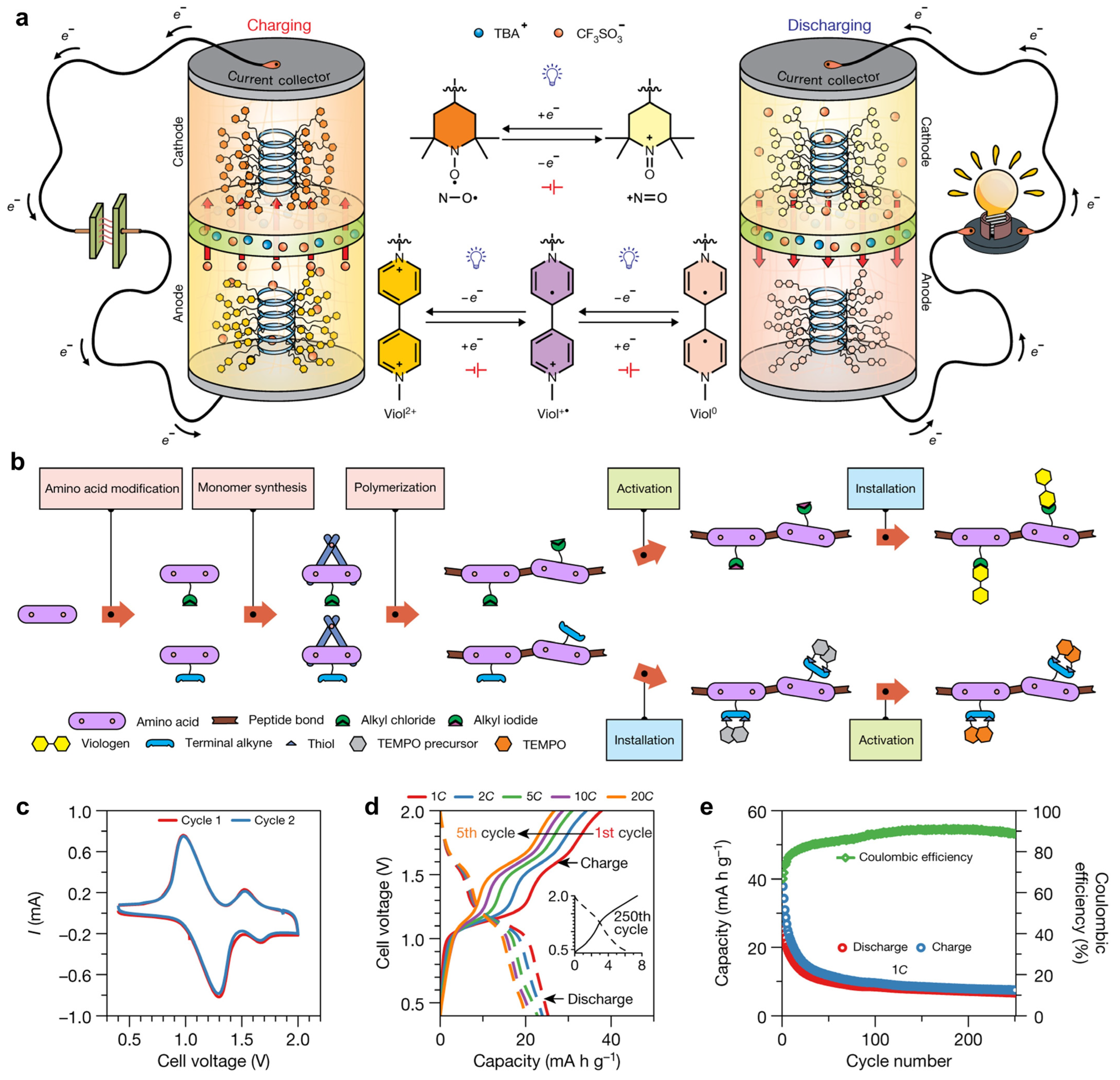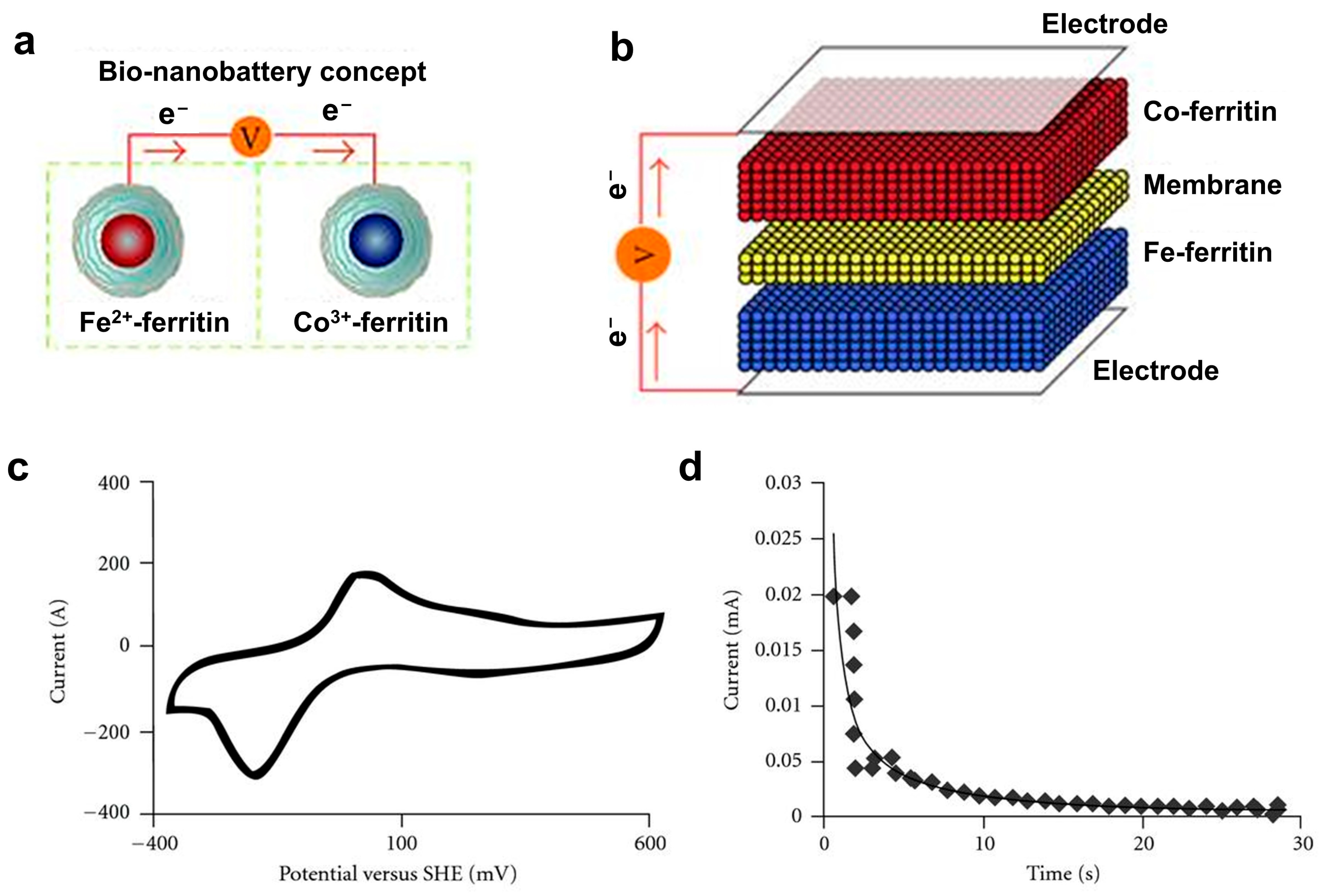 - Ferritin-based bio-nanobatteries have been developed by employing ferritins loaded with Fe(OH)2 and Co(OH)3 as anode and cathode materials, respectively. These nanoscale batteries generated stable voltage and were fully regenerable. In addition, redox-active polypeptides synthesized from amino acids have been applied as the active materials of anode and cathode of batteries, which offered competitive energy storage capacity and cycling stability while being fully degradable under mild acidic conditions.