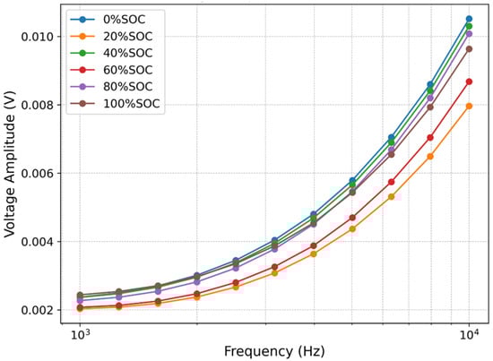 To capture the impedance response at different SOC levels, the cell was conditioned in a thermal chamber at −5 °C for 2 h. Based on the findings from reference [25], which investigated the rest period effects on LiFePO4 battery impedance measurements, a 2 h stabilization time was adopted in this experiment. The SOC was adjusted using controlled charging and discharging steps. After each aging cycle, electrochemical impedance spectroscopy (EIS) measurements were conducted at SOC levels of 0%, 20%, 40%, 60%, 80%, and 100% using an electrochemical workstation. The EIS tests were performed with an AC excitation current of 3A over a frequency range from 10 kHz to 1 kHz. As illustrated in Figure 1, the voltage amplitude responses obtained from the EIS measurements under different SOC conditions remain below 10 mV across the selected frequency range (1–10 kHz). This indicates that the applied perturbation (3A excitation current) is sufficiently small to avoid nonlinear polarization effects. Therefore, the experimental data satisfy the small-signal linearity condition, ensuring that the extracted impedance parameters accurately reflect the intrinsic electrochemical characteristics of the battery system.