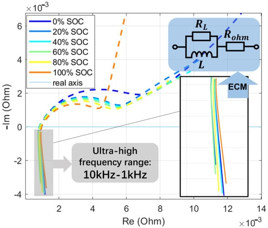 Figure 2. Nyquist plots of the battery impedance at different SOC levels (0–100%) under −5 °C and the corresponding ECM.