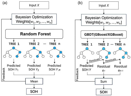 Figure 3. Schematic diagram of the proposed SOH prediction models with Bayesian-optimized feature weights. (a) Random Forest architecture. (b) GBDT framework (GBoost/XGBoost).