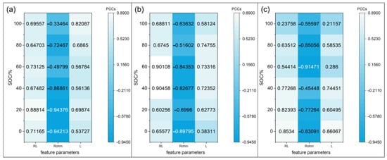 Figure 4. Pearson correlation coefficients between the extracted equivalent circuit parameters ( R L , R o h m , and L ) and SOH under different SOC conditions (0%, 20%, 40%, 60%, 80%, and 100%) for three battery cells. (a) Pearson correlation coefficients between R L , R o h m , and L and SOH for Cell B1. (b) Pearson correlation coefficients between R L , R o h m , and L and SOH for Cell B2. (c) Pearson correlation coefficients between R L , R o h m , and L and SOH for Cell B3.