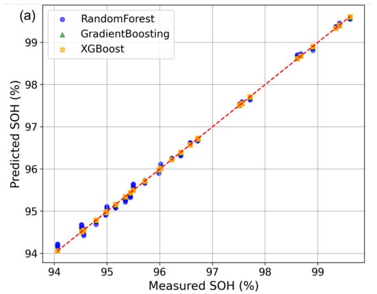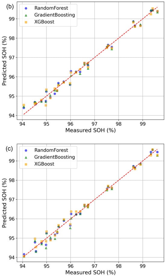 Figure 5. Predicted versus measured SOH values for the machine learning models. (a) Training set results. (b) Validation set results. (c) Test set results.