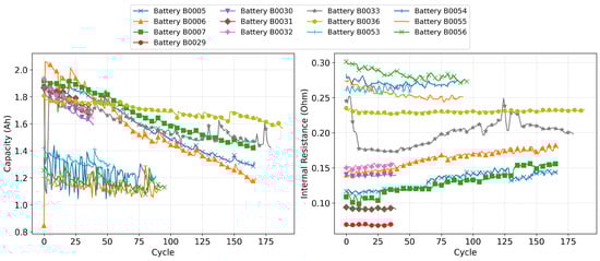 The datasets used in this study are the publicly available Li-ion Battery Aging Datasets, provided by NASA and accessible through its open data portal. NASA recorded a total of 7575 battery tests, where each test consisted of charge–discharge cycles and the characterization of internal resistance parameters [13]. To create diverse testing scenarios, nine different discharge conditions were applied to 31 batteries, with varying current and temperature settings.