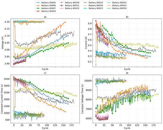 To extract the relevant features from the dataset, an evaluation was conducted to analyze how the current and voltage values varied throughout the charge and discharge cycles. Additionally, the durations of the constant-current (CC) and constant-voltage (CV) phases during charging were examined. This feature extraction process was inspired by previous studies and further expanded by incorporating variables related to battery aging, such as the temperature, current, and depth of discharge.