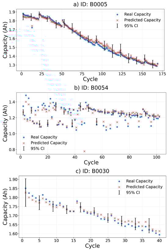 To visually illustrate the model’s effectiveness, three different models were trained, each time excluding the data from one battery (B0005, B0054, and B0030) and using the remaining batteries for training. Each model was trained 10 times to obtain a 95% confidence interval for the predictions. Figure 3 presents a comparison between the actual and predicted capacity values in the three models, and Table 3 show the metrics in each one.