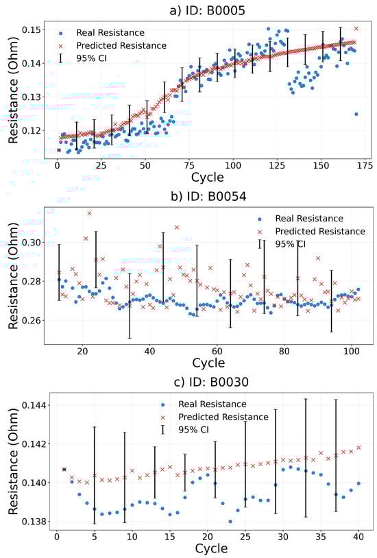 The validation metrics obtained for the three leave-one-battery-out experiments (B0005, B0054, and B0030), shown in Table 5, demonstrate the robustness of the proposed internal resistance estimation approach. Despite not having been trained with data from the excluded batteries, or with any battery sharing the same combination of current profile, depth of discharge, or operating temperature, the models achieved low MAE and RMSE values across all cases. Although the confidence intervals may appear wide in the figures, they in fact correspond to deviations of only a few tens of milliohms, which is small in practical terms. As in the case of capacity estimation, the limited number of available cycles for high-temperature batteries, such as B0030, could have influenced its results, while the greater variability typically observed in low-temperature batteries, such as B0054, may explain part of the difference in coverage obtained for these cases.