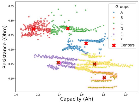 After characterizing the algorithm’s behavior, the model was applied to segment the dataset into six distinct clusters. This number of clusters was selected to achieve a balance between granularity and interpretability, allowing for the clear differentiation of batteries based on their estimated capacity and internal resistance. As illustrated in the corresponding Figure 6, each cluster is visually represented with a distinct color in a two-dimensional space defined by these two variables. The centroid of each cluster, computed during the unsupervised learning process, is marked with an ‘X’, indicating the representative center of each group. This visualization provides an intuitive overview of how the algorithm groups batteries with similar health profiles, serving as the foundation for the subsequent analysis of their suitability for second-life applications.