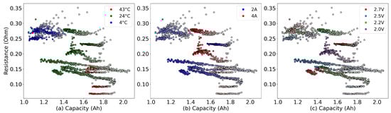 To explore the underlying patterns in the dataset, a clustering analysis was performed using estimated health parameters, including the capacity and internal resistance. When the batteries are visualized according to the environmental and operational conditions that were initially considered as classification features—specifically, the temperature, discharge current, and depth of discharge—distinct patterns emerge. As shown in Figure 7, certain clusters align with specific ranges of these variables, suggesting that external stress factors play a significant role in determining the trajectory of battery degradation. In all three subfigures, a color gradient is used to represent battery cycling progression: lighter tones correspond to early cycles, while darker, more intense tones indicate later cycles. Across the plots, a subtle shift is noticeable toward the upper-left quadrant, reflecting a general trend of increasing internal resistance and decreasing capacity as the number of cycles grows. This allows one to trace the evolution of the capacity and resistance depending on different variables. This plot is particularly interesting as, typically, only the capacity or resistance evolution is plotted. However, the combined plot provides additional insight into the battery life and its degradation.