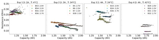 Figure 8 illustrates how the battery distributions vary depending on their depth of discharge under experimental conditions with a fixed current and temperature. In Experiment 4, where both the current and temperature were high, there was a clear trend showing that batteries subjected to lower depths of discharge exhibit reduced internal resistance. This observation aligns with previous studies, which have shown that lower depths of discharge can mitigate internal resistance growth when the current and thermal conditions are kept constant [39]. A similar pattern could be observed in Experiment 3. Notably, although battery 6 displayed the highest depth of discharge and occupied an intermediate position in terms of internal resistance, it is still grouped under this experiment in the dataset. This intermediate behavior could potentially be explained by the lower discharge current used during its cycling, despite its classification alongside batteries tested under more demanding conditions.