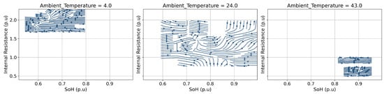 Figure 9 illustrates the vector field resulting from ambient temperature conditions. Notably, it shows a clear trend: at low temperatures (4 °C), the aging vectors point sharply toward higher internal resistance, with relatively modest SoH loss, indicating impedance-dominated degradation. At moderate temperatures (24 °C), the transitions are more evenly balanced, while, at high temperatures (43 °C), the capacity degrades rapidly, with a minimal increase in R, confirming that elevated thermal conditions favor the kinetic acceleration of side reactions without significantly worsening the internal resistance. These graphical observations align strongly with the previous conclusions regarding Experiments 2 and 4 and reinforce the role of the temperature as a primary aging determinant.