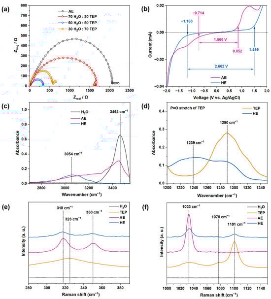 Electrochemical and spectroscopic characterization of electrolytes. (a) Nyquist plots of the electrolytes with varying H2O:TEP volumetric ratios. (b) LSV curves of the AE and HE. FT-IR spectra from (c) 2700–3500 cm−1 and (d) 1200–1350 cm−1. Raman spectra from (e) 280–390 cm−1 and (f) 1000–1150 cm−1.