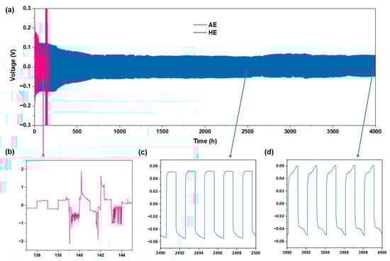 Electrochemical performance of Al–Zn symmetric cells (a) Long-term voltage profile. Enlarged voltage profiles from (b) 135–145 h of AE; (c) 2490–2500 h; and (d) 3990–4000 h in HE at 0.2 mA cm−2 and 0.2 mAh cm−2.