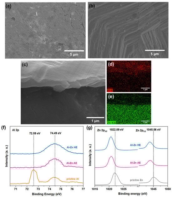 Structural analysis of electrodes after 10 cycles at 0.2 mA cm−2 and 0.2 mAh cm−2. SEM images for Al–Zn cycled in (a) AE and (b) HE. (c) Cross-section HR FE-SEM image for Al–Zn cycled in HE with EDS mapping of (d) Al and (e) Zn. XPS spectra of (f) Al 2p and (g) Zn2p.