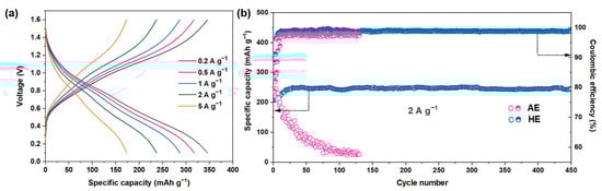 Figure 4 demonstrates the electrochemical performance of the V2O5/C || Al–Zn full cell. The galvanostatic charge–discharge (GCD) profile at various current densities in the HE (Figure 4a) confirms its robust charge transfer kinetics. The cell delivered high reversible capacities of 378, 337, 295, 248, and 182 mAh g−1 at 0.2, 0.5, 1, 2, and 5 A g−1, respectively, showcasing excellent rate capability. Even at a high current of 5 A g−1, a well-defined voltage profile was retained, indicating stable and fast charge transfer within the unique solvation structure of the HE.