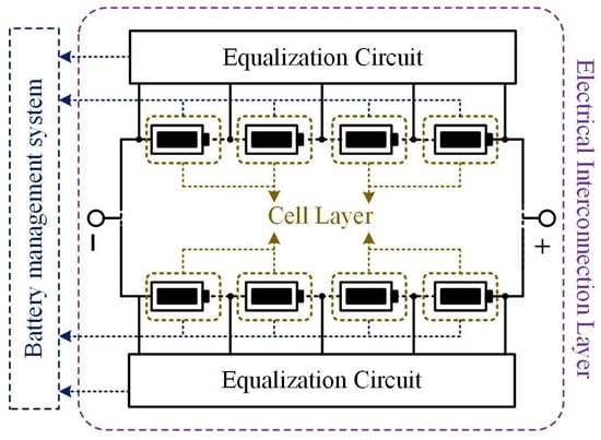 A battery reconfiguration system is formed by retired cells that have been screened and regrouped according to defined performance criteria. It typically consists of three key components: the cell layer, the electrical interconnection layer, and the battery management system (BMS), as illustrated in Figure 1.