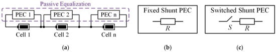 In battery systems equipped with passive equalization circuits (PEC), resistors are connected in parallel with individual cells to dissipate excess energy and align cell voltages. The typical topologies for such systems are categorized into fixed shunt and switched shunt configurations [18], as illustrated in Figure 3.