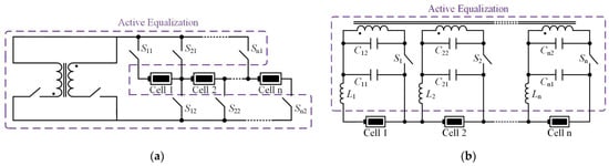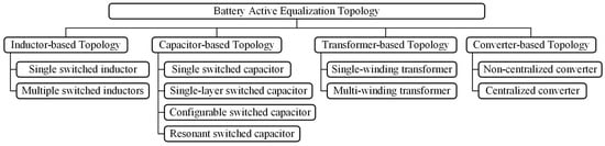 Active equalization systems employ an energy transfer element to rapidly redistribute energy among individual cells, avoiding the resistive loss inherent in passive methods. As a result, they typically deliver higher energy-utilization efficiency and faster balancing. According to the type of transfer element, common topologies are grouped into inductor-, capacitor-, transformer-, and power-electronic-converter-based designs [23,24], as shown in Figure 5.