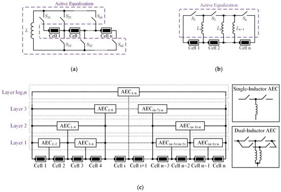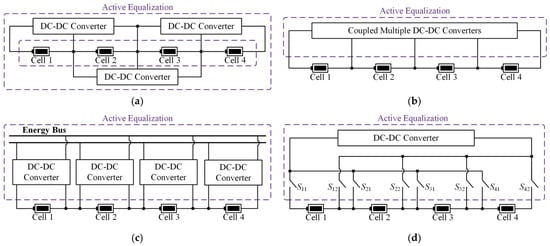 Typical power electronic converter-based active equalization topology: (a) adjacent cell-to-cell AEC; (b) string-to-cell AEC; (c) energy bus-based AEC; (d) centralized AEC.