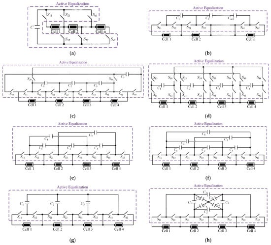 Typical capacitor-based active equalization topology: (a) single SC-based AEC, (b) single-layer SC-based AEC, (c) chain-structured SC-based AEC, (d) series-parallel SC-based AEC, (e) dual-layer SC-based AEC, (f) delta-structured SC-based AEC, (g) star-structured SC-based AEC, (h) mesh-structured SC-based AEC.