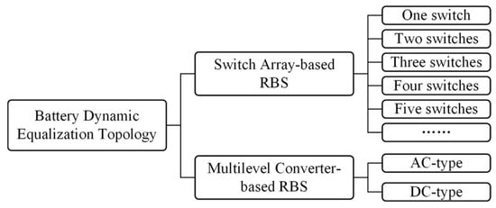 In general, the basic building block of an RBS is the energy storage unit (ESU), which can be either a single cell or a module. However, using cell-level ESUs provides the greatest flexibility in system configuration and maximizes energy utilization [93]. Based on the ESU connection approach, RBS architectures have evolved along two main technical paths: switch array-based and multilevel converter-based topologies, as shown in Figure 11.