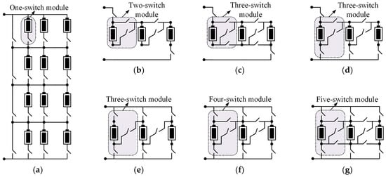 Typical switch array-based dynamic equalization topology: (a) one-switch module; (b) two-switch module; (c–e) three-switch module; (f) four-switch module; (g) five-switch module.