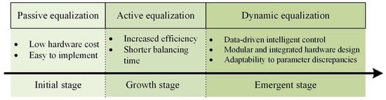 To mitigate these effects, it is essential to implement effective equalization management strategies. By leveraging appropriate topological designs and control methods, energy flow can be dynamically regulated and redistributed, enabling adaptive operation and improved performance at the system level [12]. This study investigates the reassembly of retired Li-ion batteries, with an emphasis on equalization management during system integration. It provides a systematic review of representative topologies and control strategies across three major categories of equalization technologies: passive, active, and dynamic. Their applicability, technical advantages, and associated challenges in second-life battery systems are critically evaluated. The insights presented herein offer both theoretical foundations and practical guidance to support the large-scale deployment of retired batteries, promoting the development of safer and more efficient energy storage systems.