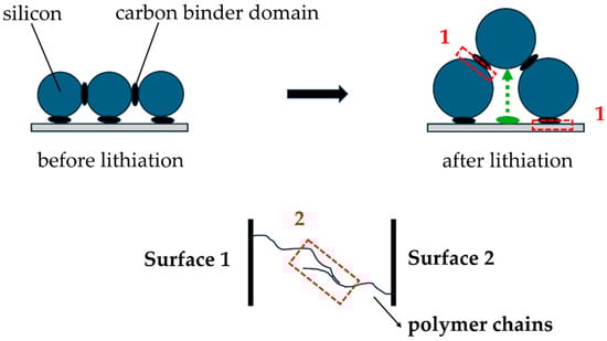 Illustration of the movements of silicon particles and the rearrangement of polymer binders during lithiation. Adhesive (red box 1) and cohesive (red box 2) connections are required for successful binder behavior. Cohesive connections must be able to elongate significantly (green arrow) or gracefully release and reattach, or failure will occur upon cycling.