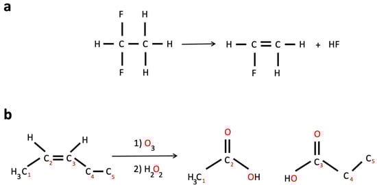 (a) Dehydrofluorination and (b) oxidative cleavage reactions.