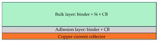Two different multilayer anodes were prepared, one made of PVDF and the other made of PAA binders. The binder (dissolved in solvent) was further mixed with carbon black in a mass ratio of 1:0.25, respectively. The mixture was magnetically stirred for 1 h at room temperature. The resulting slurry was then coated to a thickness of 50 μm using a coating bar on the copper sheet, which was previously sanded and treated with 10 wt% oxalic acid in water to remove any potential copper oxide layers. The adhesion layer was then dried at 100 °C for 3 h to eliminate any moisture. Subsequently, a bulk electrode layer comprising a binder, silicon, and carbon black in water was coated on top of the adhesion layer. This electrode was further dried in an oven at 100 °C for 6 h.