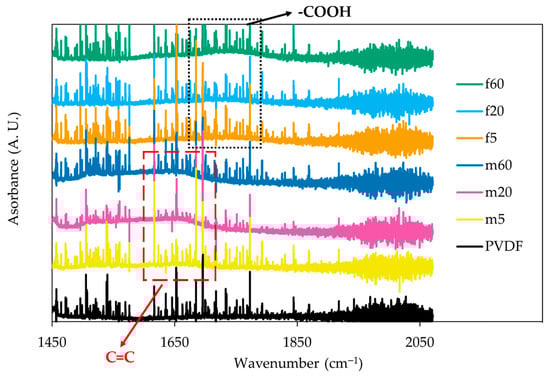 Figure 4 shows the FTIR spectra of both intermediate samples (m5, m20, and m60) and final products (f5, f20, and f60). Pristine PVDF serves as a baseline for comparison. In the pristine PVDF, there is an absence of C=C and -COOH peaks, which confirms that the observed new peaks in the modified samples are indeed due to the chemical treatments applied. For the intermediate samples, peaks in the region around 1640 cm−1 are typically associated with C=C stretching vibrations, suggesting the formation of double bonds during the dehydrofluorination process in these samples [27]. In addition, the m60 sample exhibits the most intensive peak, indicating a higher concentration of C=C bonds than other samples. In the final products, the peak observed at 1720 cm−1 is attributed to -COOH [26]. The f60 sample also demonstrates the highest intensity, suggesting that it contains the greatest amount of -COOH.
