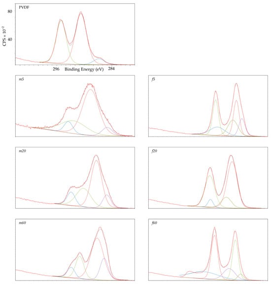It was expected that the percentages of these two peaks would decrease the peaks of CH2 and CF2 and maintain the same ratio as observed in pristine PVDF for HF formation, according to the reaction described above. However, Table 2 suggests that the ratio of C=C to -COOH varies in each sample. With extended reaction times, other reaction pathways may emerge, potentially causing an imbalance between the formation of new C=C bonds and the reduction of CF2 and CH2 groups. Moreover, VDF monomer additions in the polymerization process can occur head-to-head instead of head-to-tail, leading to 5–10% regioirregular defects in the pristine PVDF material [28], which can contribute to these observed variations in our products.