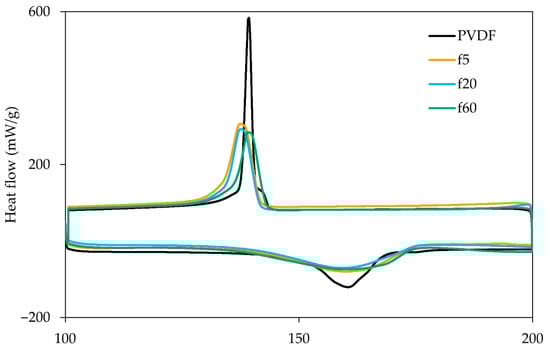 Upon cooling, the crystallization peaks for the modified PVDF samples were observed to be less intense than those of the pristine PVDF, with the f60 sample displaying a particularly notable trend. The f60 crystallization peak emerges at a higher temperature compared to the f5 and f20 samples. This suggests that the f60 sample may begin to crystallize more readily. The propensity for earlier crystallization in the f60 sample could be linked to its shorter polymer chains, which are likely to possess greater mobility, thereby enabling a more efficient transition into an ordered, crystalline arrangement. Additionally, the reduction in chain entanglement for the f60 sample may simplify the alignment and packing of the chains, further promoting crystallization at elevated temperatures.