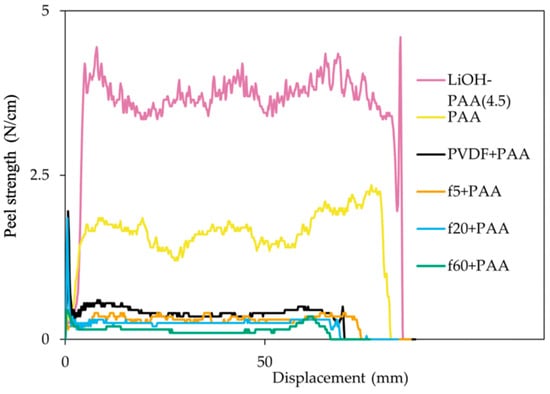Peel strength of LiOH-PAA (4.5), PAA, PVDF + PAA, f5 + PAA, f20 + PAA, and f60 + PAA electrodes.