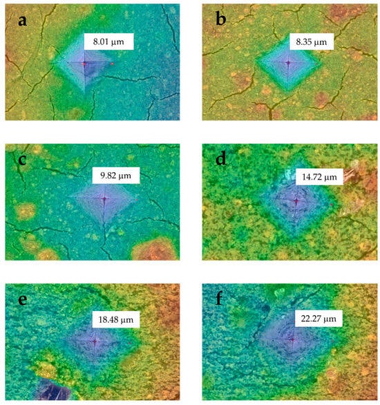 VHX-7000 digital microscope images of nano-indentation results for (a) PAA; (b) LiOH-PAA(4.5); (c) PVDF + PAA; (d) f5 + PAA; (e) f20 + PAA; and (f) f60 + PAA electrodes. The size of the indentation, given by the distance between the two red dots, is indicated on each image.