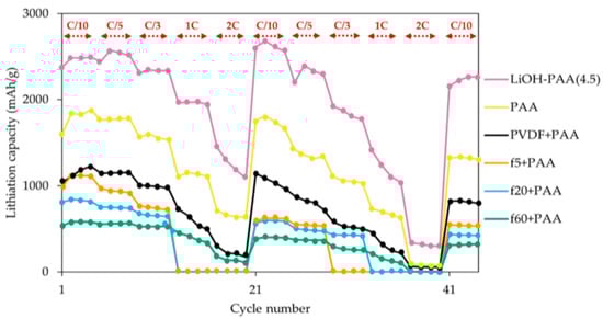 Cycling performance at room temperature for LiOH-PAA (4.5), PAA, PVDF + PAA, f5 + PAA, f20 + PAA, and f60 + PAA electrodes. The C-rate is modified every 4 cycles, as indicated in the red text (C/10, C/5, C/3, 1C, and 2C). Capacities are given in terms of active material. Lines between experimental points are a guide for the eye.