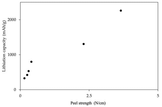 Figure 10 demonstrates a positive correlation between average peel strength and the delithiation capacity of the samples tested at cycle 41 (C/10). As electrode adhesion improves, the electrochemical performance of the cell is likewise enhanced, underscoring the critical role of binder–collector interactions. Linear regression analysis yielded a strong correlation R2 = 0.96, p < 0.001) with the regression equation, y = 533x + 321, where y represents capacity (mAh/g) and x represents peel strength (N/cm). This strong correlation suggests that mechanical adhesion is a key factor in optimizing the overall performance and durability of Si-based electrodes.